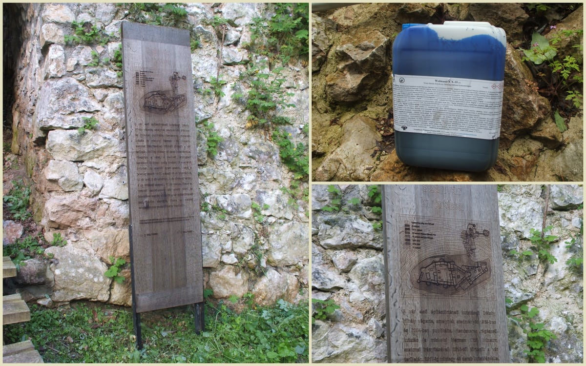 Szombat reggel a Várhegy környezetében már csak néhány párás felhő jelezte az éjszakai esőt. Nagy szerencsére az időjárás a kegyesebb arcát fordította felénk, nem esett, sőt a hűvösebb idő direkt jól jött a munkához. Bemasírozva a Csiga udvarára néhányan ott is ragadtak, hiszen méteres csalánrengeteg fogadott minket. A felzúgó fűkasza hamarosan széles csapást vágott az ellenség zöld tengerében. A piktornak felcsapott tagok megmustrálták a fából készült tárgyakat, végül az egyik információs táblát kiválasztva, rajta próbálták ki a festő tehetségüket.