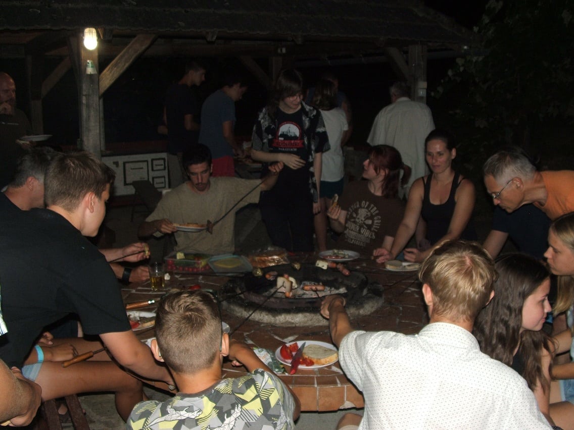 Az ismerősök üdvözölték egymást, míg az addig ismeretlen arcokkal hamar megtaláltuk a közös nevezőt. Sercegett a szalonna zsírja, zsongott a beszélgetés fonala, nagy örömmel készültünk az előttünk álló dolgos, de általunk oly kívánatos hétre. Szállásunkat természetesen ismét a Nyárádi-Major kőházában, faházaiban és udvarán foglaltuk el, ez utóbbin terjedelmes sátortábor nyújtózkodott el a gyümölcsfák között.